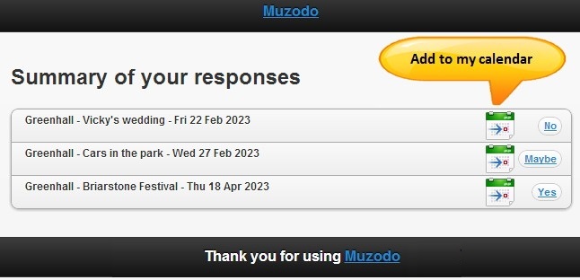 You can copy events into your calendar while viewing event details in Muzodo or just after you've responded to an event notification email.
