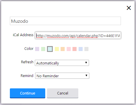 Change the calendar name to Muzodo, copy and paste your calendar URL and click Continue