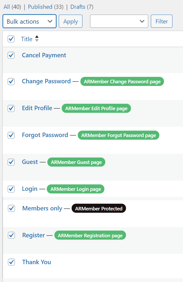 Note also that ARMember installs some pages that we don't need, so we'll delete those (see below).