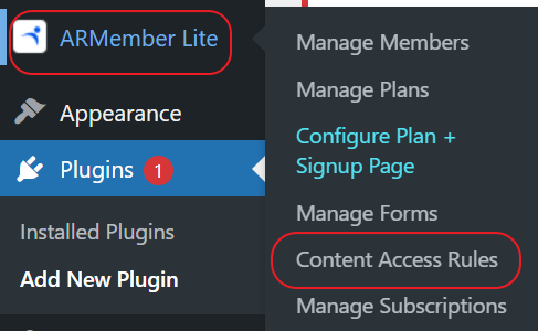 Next up is to decide how you want your member pages to work. In your WordPress menu, select 'ARMember Lite' and then 'Content Access Rules'.