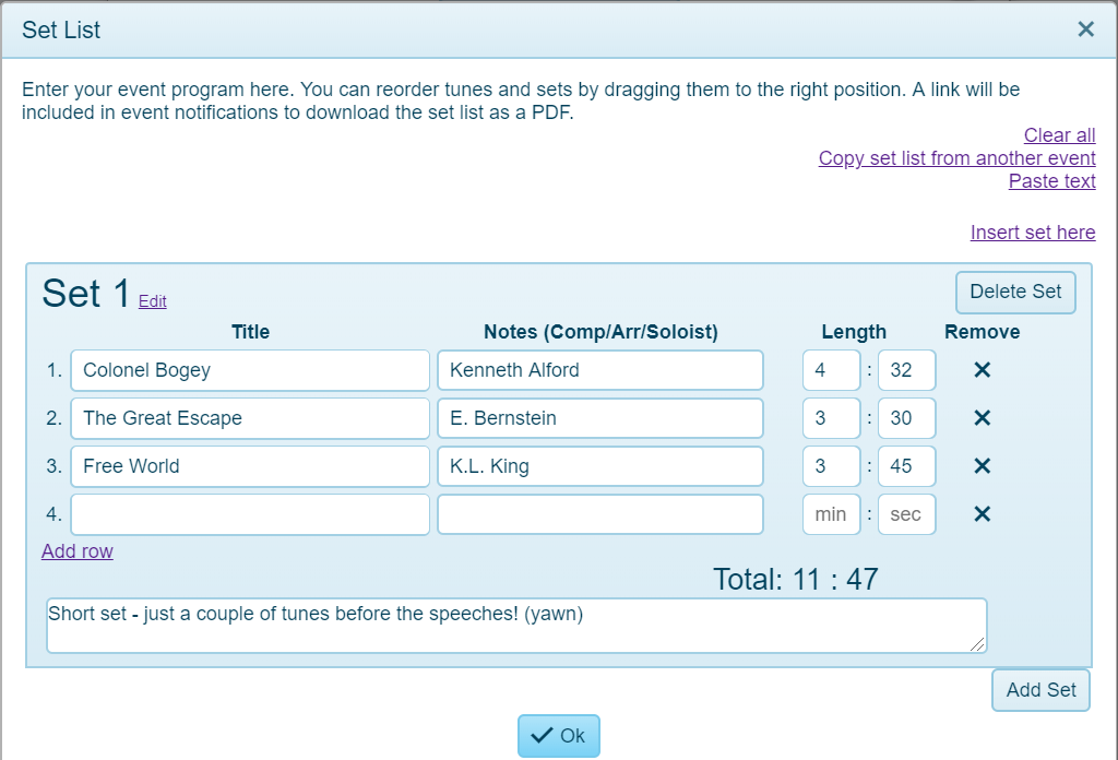 For convenience, you can copy and paste set lists from text. The text needs to be in a specific format, a tune per line, with quotes around the title and a comma separating the title from the composer/arranger, such as: